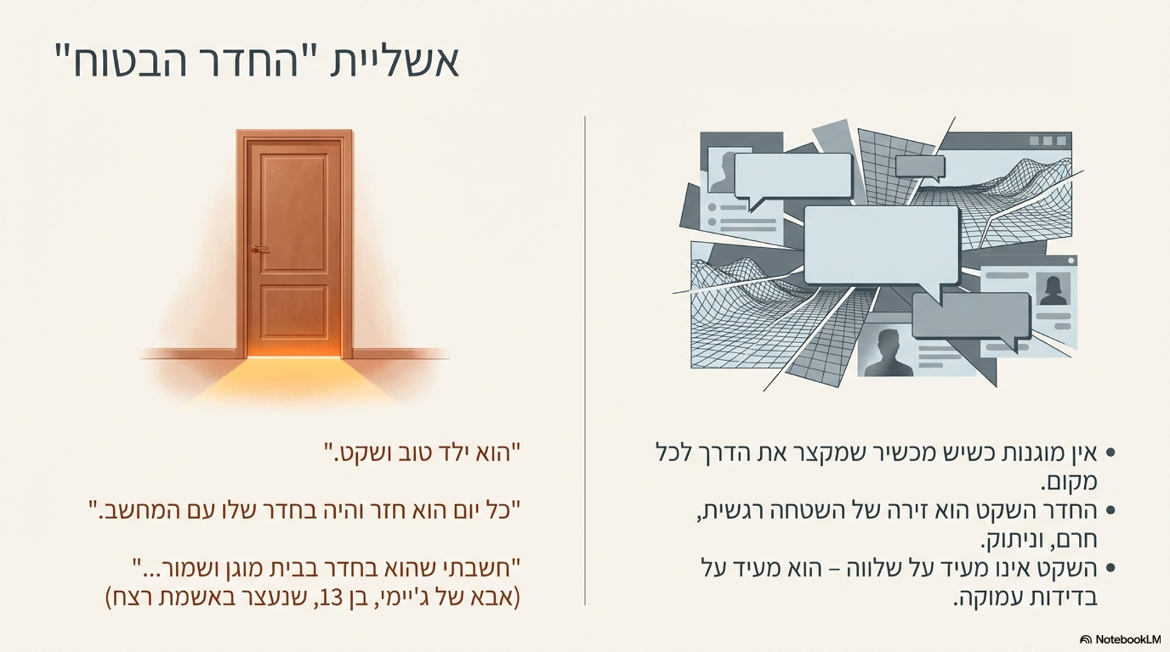 הוא היה שמור ומוגן בבית, בחדר שלו, "כל יום הוא חזר והיה בחדר שלו עם המחשב..." .