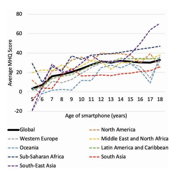 וחשוב לציין, מי שקיבל סמרטפון בגיל 13 או בגיל מאוחר יותר, מדד בריאות הנפש - ציון ה MHQ שלו גם לא מזהיר, מדובר על 30 נקודות מתוך 100 למי שמעל גיל 13 קיבל מכשיר נייד לראשונה, בגיל 13 ומעלה המדד מתייצב סביב הציון 30, בעוד מי שקיבל מכשיר חכם לני גיל 13 הציון יורד בהתמדה עד ל- 1 למי שקיבל נייד בגיל 5.