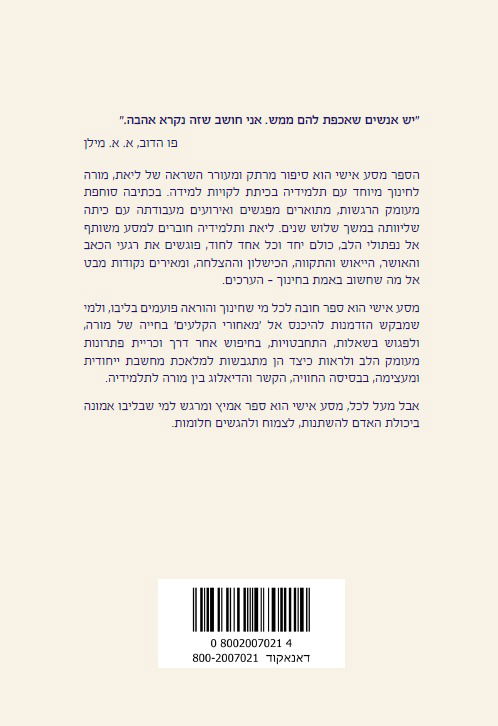 ליאת בעלת 15 שנות ניסיון בחינוך, הוראה והדרכת מורים בכיתות של ילדים ונוער עם לקויות למידה, הבינה ליאת שהיא חייבת לחלוק ולשתף בשאלות שעמדו לנגד עיניה בכל פעם שפגשה תלמיד, ובתובנות שצמחו מאותה פגישה. אלה הלכו והתגבשו לגישה ותפיסה חינוכית, ששמה במרכז את החוויה, הקשר והדיאלוג בין מורה לתלמידיה. בספר שכתבה, ובמרחב למידה שפתחה לתלמידים ומורים, ליאת מאירה נקודות מבט אל ההזדמנות ההדדית המופלאה שטמונה במפגש בין מורה לתלמיד - לפגוש בשינוי, צמיחה והתפתחות, ולהאיר את המשמעות הכבירה למעשים של עצמנו.